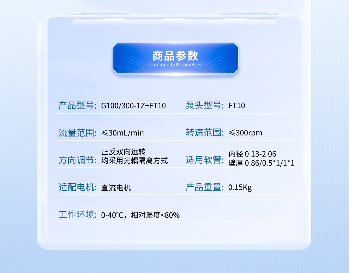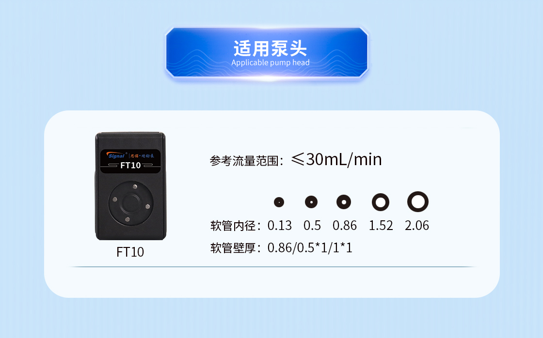 1.流量范圍:<30mL/min 2.控制與泵頭一體化設計,整體更加緊湊 3.上蓋與壓塊聯動機構,安裝軟管更方便 4.彈管壓塊,可適配多種軟管 5.直流電機驅動泵 6.透明觀察窗可方便查看泵頭運行狀態 7.開蓋傳感器(選裝):泵蓋打開,自動報警或:停止運行