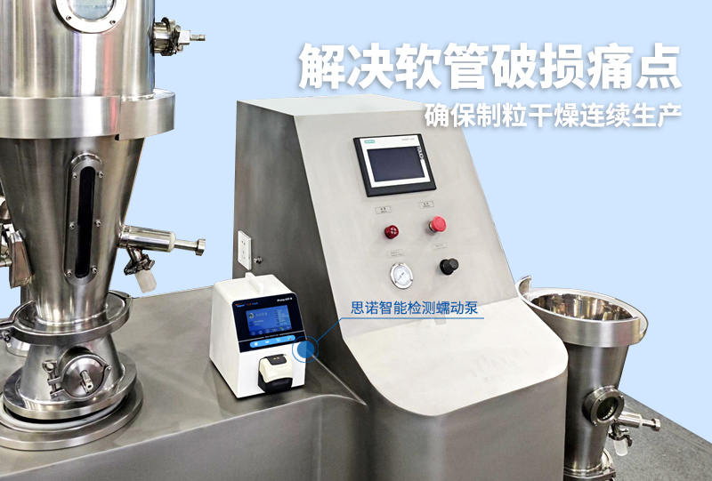 在固體制劑生產中,制粒干燥機需要通過蠕動泵將粘合劑等液體物料提升至一定高度(即具備足夠的蠕動泵揚程),穩定輸送到混合制粒腔內。這一過程對蠕動泵的性能提出了雙重挑戰:它既需要克服垂直管道帶來的阻力與壓力,保證流量的穩定;又不能因軟管長期承壓運行而破損導致的泄漏風險。一旦在高揚程工況下發生泄漏,液體不僅浪費,更可能自上而下灑落,對下方設備造成廣泛的污染與電氣安全隱患。